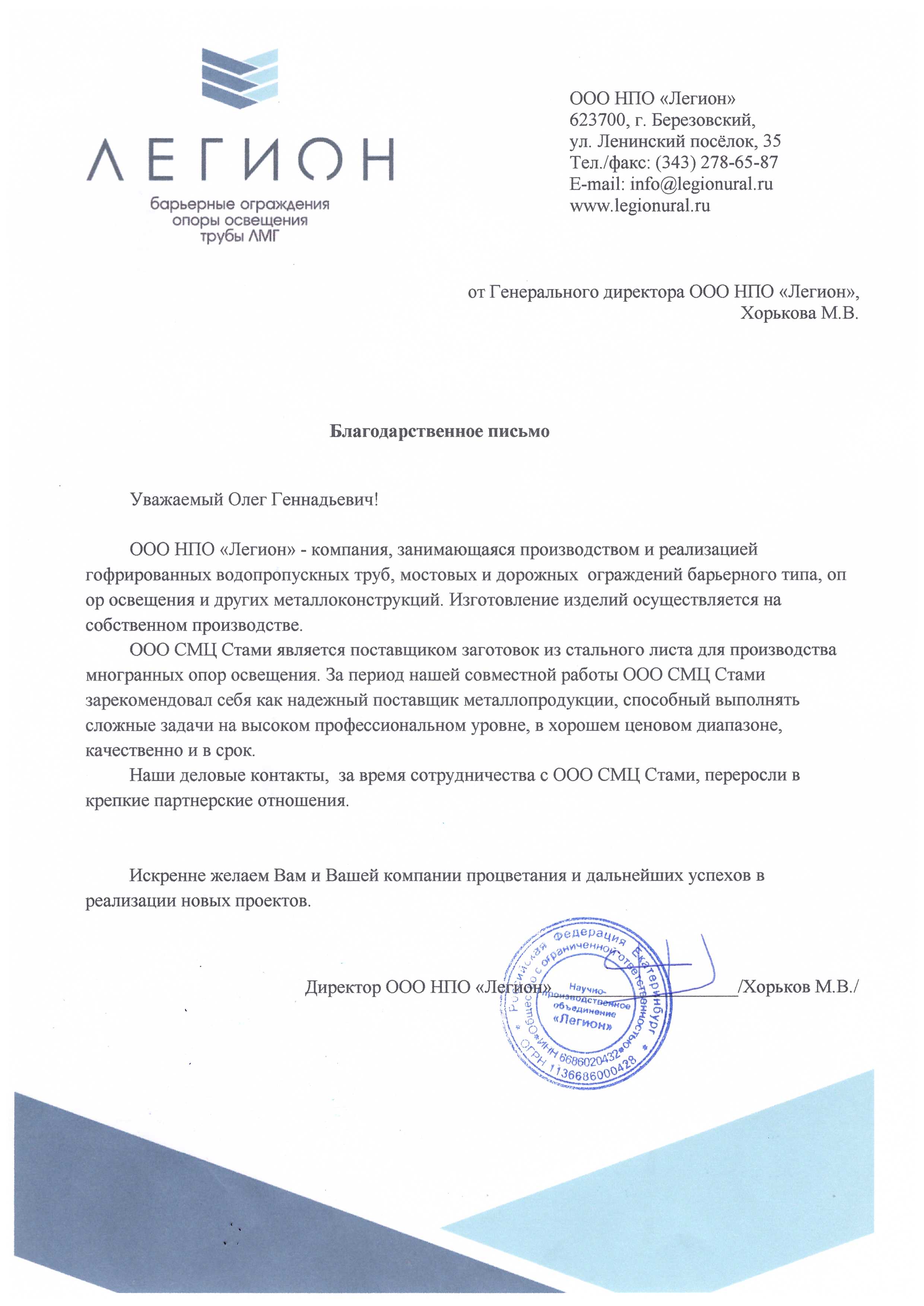 ООО НПО «Легион»- компания, занимающая производством и реализацией гофрированных водопроводных труб… За период нашей совместной работы ООО СМЦ Стами зарекомендовал себя как надёжный поставщик металлопродукции, способный выполнять сложные задачи на высоком профессиональном уровне, в хорошем ценовом диапазоне, качественно и в срок…Искренне желаем Вам и Вашей компании процветания и дальнейших успехов в реализации новых проектов.