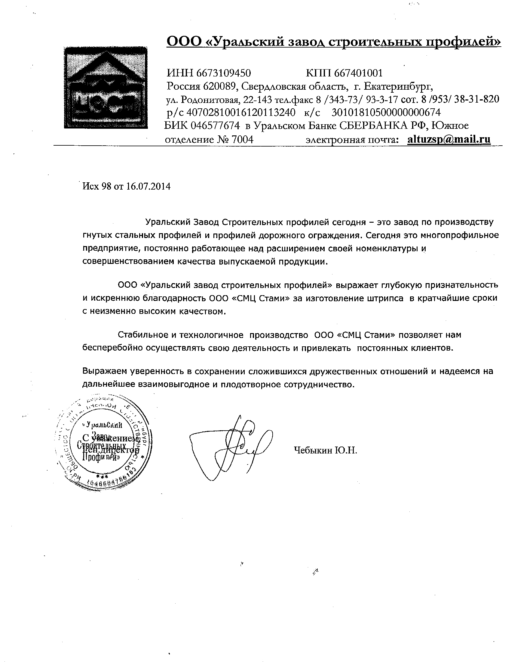 ООО «Уральский завод строительных профилей» выражает глубокую признательность и искреннюю благодарность ООО «СМЦ «Стами» за изготовление штрипса в кратчайшие сроки и неизменно высоким качеством.
